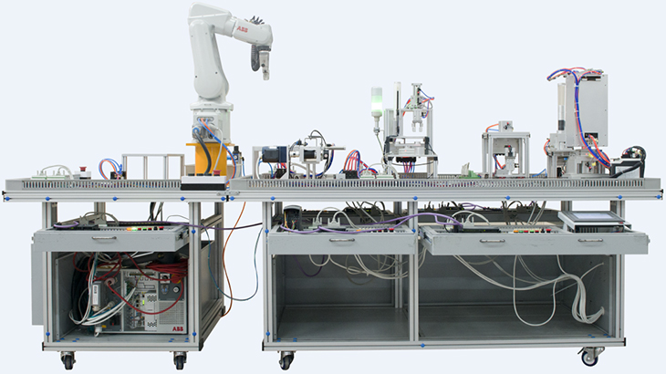 其中,每一工作單元都可自成一個獨立的系統,同時也都是一個機電一體化的系統。各個單元的執行機構基本上以氣動執行機構為主,但輸送單元的機械手裝置整體運動則采取伺服電機驅動、精密定位的位置控制,該驅動系統具有長行程、多定位點的特點,是一個典型的一維位置控制系統。分揀單元的傳送帶驅動則采用了通用變頻器驅動三相異步電動機的交流傳動裝置,對物料進行分揀。碼垛單元使用的是工業機器人,對物料進行入庫和拆分出庫。機器人控制技術、伺服位置定位控制和變頻器技術是現代工業企業應用最為廣泛的自動化控制技術。