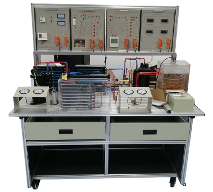 制冷與制熱系統(tǒng)技能實(shí)訓(xùn)裝置該產(chǎn)品包含了制冷、熱力學(xué)、傳熱學(xué)和電氣控制等技術(shù),主要由熱泵型家用空調(diào)系統(tǒng)和空氣源熱泵系統(tǒng)兩大部分組成。在鋁合金導(dǎo)軌式實(shí)訓(xùn)臺(tái)上安裝冷凝器、蒸發(fā)器、節(jié)流裝置、壓縮機(jī)、控制電路等,構(gòu)成一個(gè)典型的制冷裝置,電氣控制采用掛箱式,能進(jìn)行制冷系統(tǒng)的組裝、調(diào)試、運(yùn)行,真實(shí)呈現(xiàn)制冷裝置的工作過(guò)程,通過(guò)對(duì)制冷系統(tǒng)的安裝、保壓、檢漏、抽真空、電氣連線、加氟、系統(tǒng)調(diào)試及工況調(diào)整等,完成對(duì)學(xué)生的現(xiàn)代制冷與空調(diào)系統(tǒng)設(shè)備安裝、調(diào)試和維修技能訓(xùn)練。