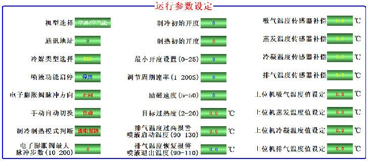 11)、顯示界面上29 路參數(shù)控制參數(shù)設(shè)置/查詢:控制器內(nèi)所有與控制相關(guān)的溫度參數(shù)、時(shí)間參數(shù)、控制參數(shù)、等29個(gè)參數(shù)都可以調(diào)整,以適應(yīng)制冷/熱泵/冷庫(kù)/水機(jī)等設(shè)備。