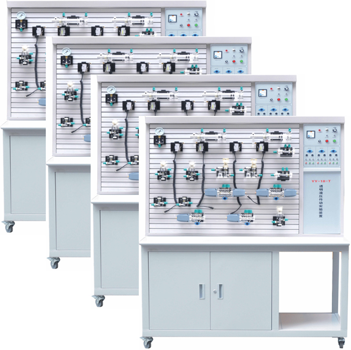 透明液壓實驗臺專利技術是上海碩博公司為實現液壓傳動課程現代化教學而進行研究的最新科技成果,它填補了技校、中專、大專院校的液壓傳動透明教學設備的國家空白。液壓傳動具有重量輕、功率大、結構簡單、布局靈活、控制方便等特點、速度、扭矩、功率均可作無級調節,能迅速換向和變速,調速范圍寬,快速性好,工作平穩、噪音小,元器件已實現系列化、標準化,通用化等一系列優點,隨著科學技術的發展,液壓傳動作為一種可以傳遞動力和控制的傳動方式,已經日益廣泛應用到醫療、科技、軍事、工業自動化生產、起動、運輸、礦山、建筑、航空等各個領域。為了適應在短暫課堂時間內,完成多個液壓油路的教學內容。同時對比演示多個不同油路的工作原理。而且,使油路系統的安裝調試有必要的程序且不占用上課教學時間。就必須有多臺設備同時工作。同時,YY-18 型透明液壓演示系統對實驗回路之一進行組合實驗時,使80% 的透明液壓元件閑置,YY-18F型“四合一”透明液壓傳動演示系統,在增加與保證實驗項目及功能的前提下, 根據在同一課時做不同演示實驗的原則,有效利用透明液壓元件進行優化組合,使產品的性能價格下降40% 。同時增加了新的液壓元件:雙作用式葉片泵,擺線式轉子泵,先導式溢流閥,Y型三位四通電磁換向閥, 實心雙出桿油缸,空心雙出桿油缸,油盤....